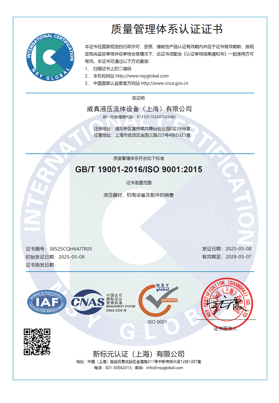 • 威真液壓已完成ISO9001質(zhì)量體認證